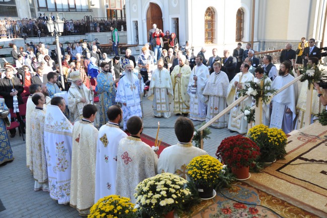 După slujba de resfinţire prin ungere cu Sfântul şi Marele Mir şi prin stropire cu apă sfinţită, atât la exteriorul, cât şi la interiorul bisericii, soborul slujitor, condus de cei doi ierarhi, a oficiat Sfânta Liturghie pe un podium special amenajat în curtea lăcaşului de închinăciune. Înainte de începerea dumnezeieştii slujbe, IPS Teofan a adresat câteva cuvinte credincioşilor şi oficialităţilor prezente: „Mare este Dumnezeu întru Sfinţii Săi, şi rugăciunile acestor sfinţi, care sunt şi ocrotitorii acestui lăcaş, au făcut ca Dumnezeu să Se milostivească şi, dintr-o biserică care acum câţiva ani era aproape părăsită, să devină biserică preafrumoasă şi mireasa mult-împodobită a lui Hristos Domnul. Văzând astăzi frumuseţea acestei biserici, şi ştiind cât de greu le-a fost enoriaşilor şi preotului paroh de-a lungul timpului să ducă o viaţă parohială cât de cât normală, nu pot să cred decât că Dumnezeu a împlinit rugăciunea şi lacrima părintelui Dumitru Merticaru, cât şi dorul credincioşilor pe care-i păstoreşte. Bucuria părintelui paroh este cu atât mai mare cu cât fratele după trup al Sfinţiei Sale, PS Varlaam Merticaru, este şi el prezent astăzi la sărbătoarea noastră“.